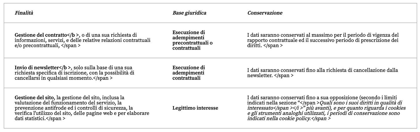 Qui di seguito le indichiamo le finalità del trattamento, la base giuridica che legittima il trattamento e il tempo di conservazione dei suoi dati personali: